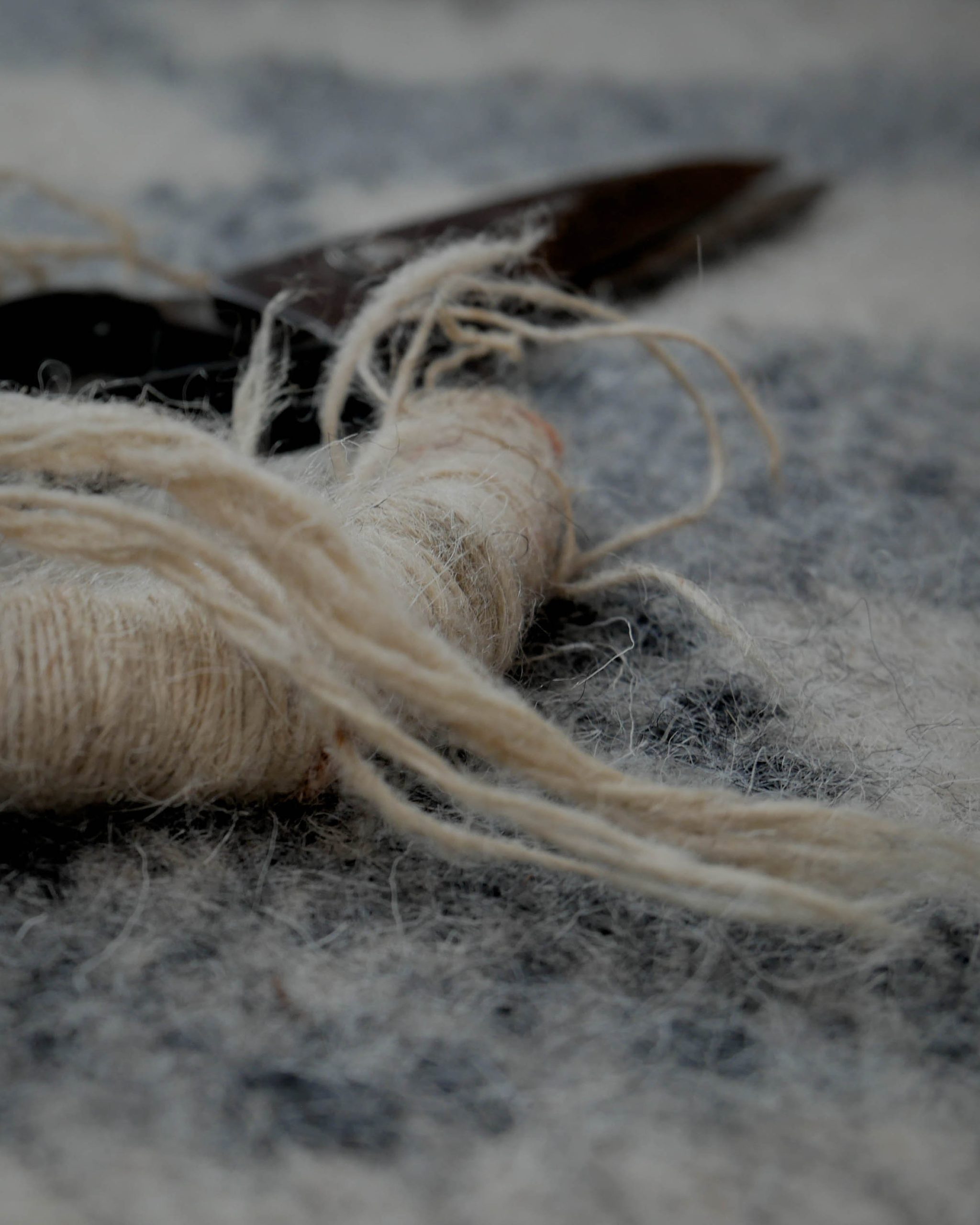 Un lavage à l’eau chaude feutre légèrement la laine de mouton, donnant au tapis sa douceur et sa robustesse uniques. Il est ensuite étiré pour en fixer la forme et les dimensions, puis séché à l’air libre pour préserver sa texture naturelle.