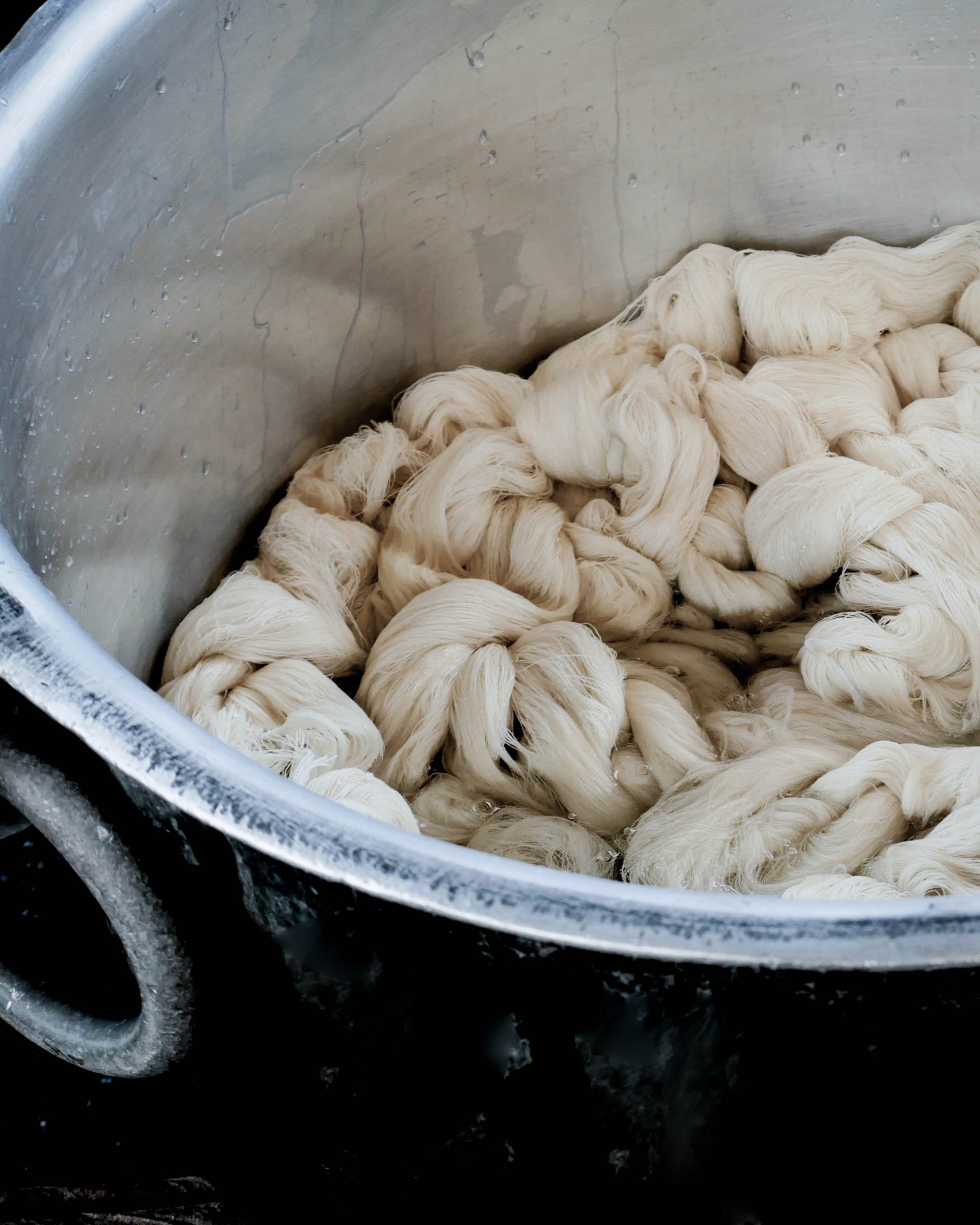 Le fil est plongé dans des cuves par des maîtres coloristes. Le processus peut durer de une à deux semaines. Teintures végétales, naturelles ou synthétiques respectueuses de l’environnement offrent une large palette de couleurs selon la demande.