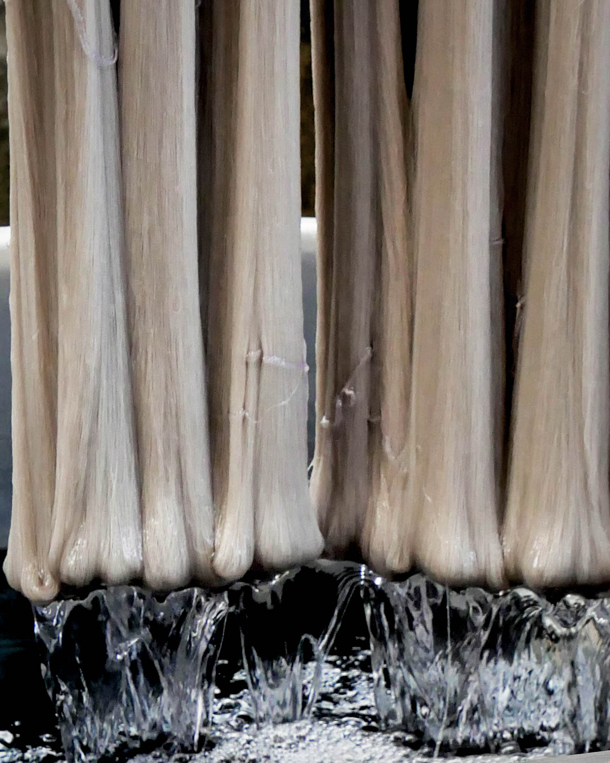 Lavage, filage, teinture, étirement… chaque geste devient méditation, un dialogue intime entre la patience de l’homme et les forces naturelles. Les fils s’élèvent et s’abaissent, couche après couche ; le plus infime tiraillement, la plus subtile torsion, s’emplissent d’une magie imperceptible.