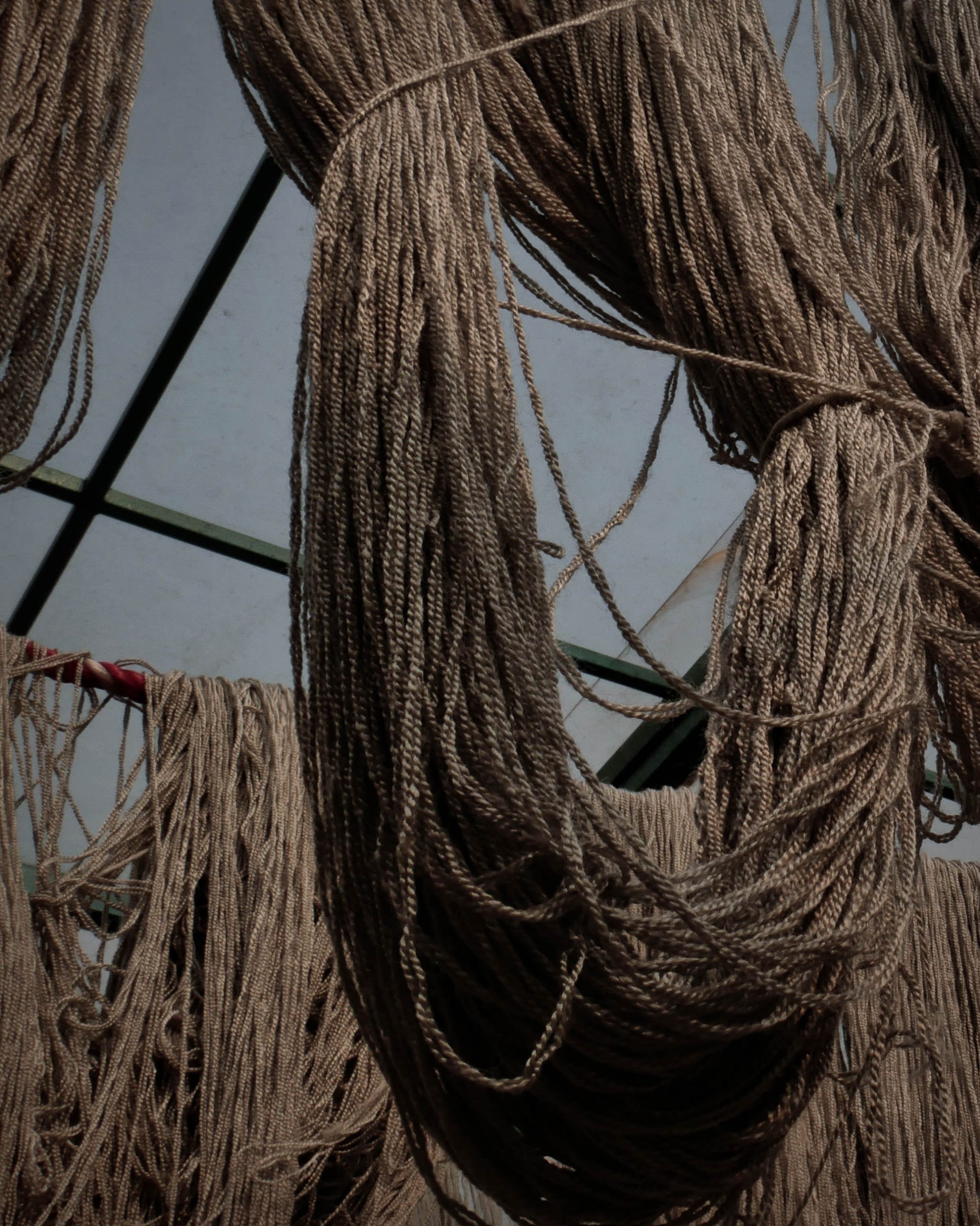Autrefois filée à la main au charkha, la laine est désormais principalement filée à la machine en fils doux et légers de longueurs variées. Les fileurs népalais expérimentés supervisent toujours la production pour garantir des fils adaptés, qu’ils soient grossiers ou fins, selon la nécessité du produit final.
